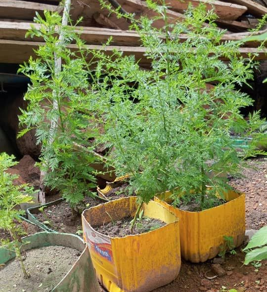 Mars 2025 : Avec CASE Burkina, Plantations d’Artemisia, pour lutter contre le paludisme en pot à côté des maisons de six familles à Dédougou, avec l’aide, la formation et le suivi des jeunes techniciennes agricoles, Judith et Delphine.